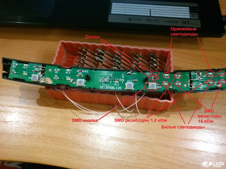 Если нужна подсветка, тогда потребуются SMD-светодиоды и резисторы на 15 кОм и 1,2 кОм. Размещаем их рядом с кнопкой, как на фото:
