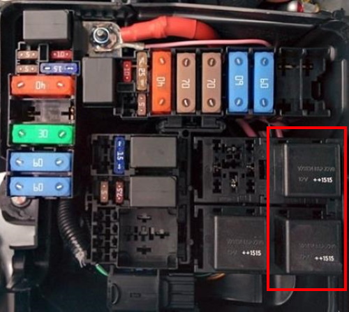 Перед заменой (инструкция) убедитесь, что на вашей Весте есть необходимые провода питания. Определить это можно по монтажному блоку, который установлен в моторном отсеке, а точнее по наличию колодок для установки реле (отмечено красным). На фото 1 - реле есть, фото 2 - реле нет):