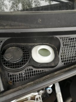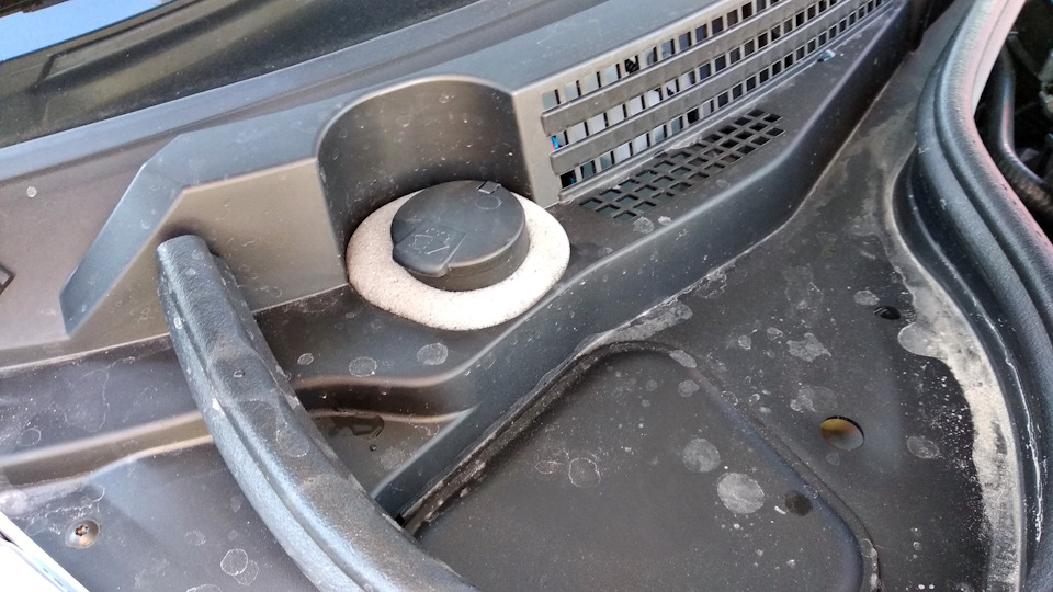 Можно вместо поролона установить специальное резиновое уплотнительное кольцо для бачка омывателя. Оно закрывает горловину бака, не рассыпается от температуры, и не портится от омывающей жидкости. Кроме того, кольцо сочетается с жабо и придает гармоничный, законченный вид вокруг бачка омывателя в подкапотном пространстве.
