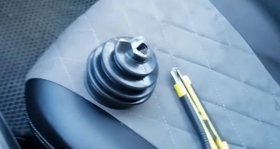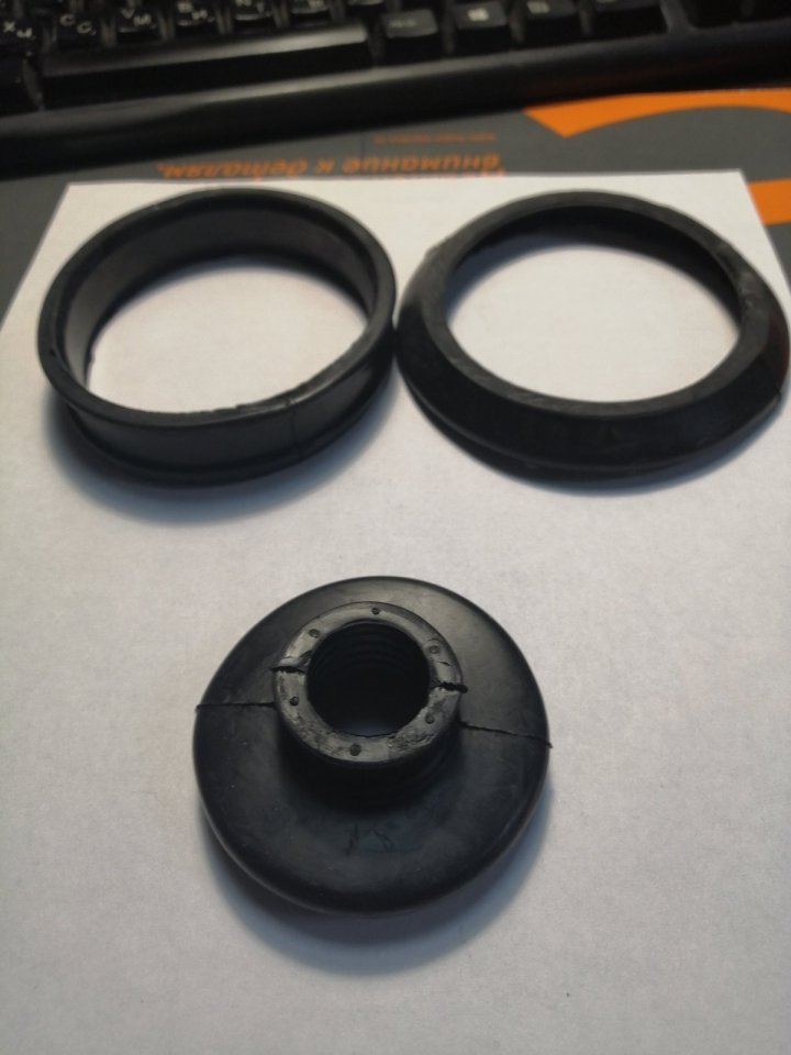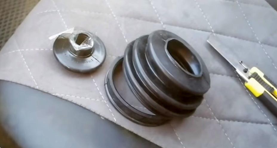 Потребуется наружный пыльник ШРУС от ВАЗ 2109. Далее отрезаем его нижнюю часть около хомута и одно верхнее кольцо. Устанавливаем на горловину: