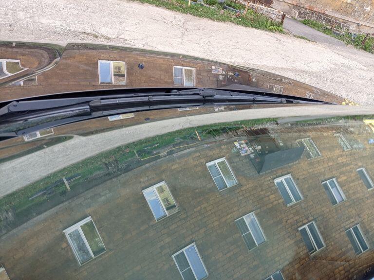 Вот так работают новые веерные форсунки в паре со стеклоочистителями нового образца: