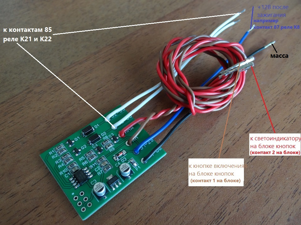 14. В салоне к модулю обогрева подключить провода, как указано на фото. Провести к блоку кнопок два провода от модуля — для кнопки и для индикатора.