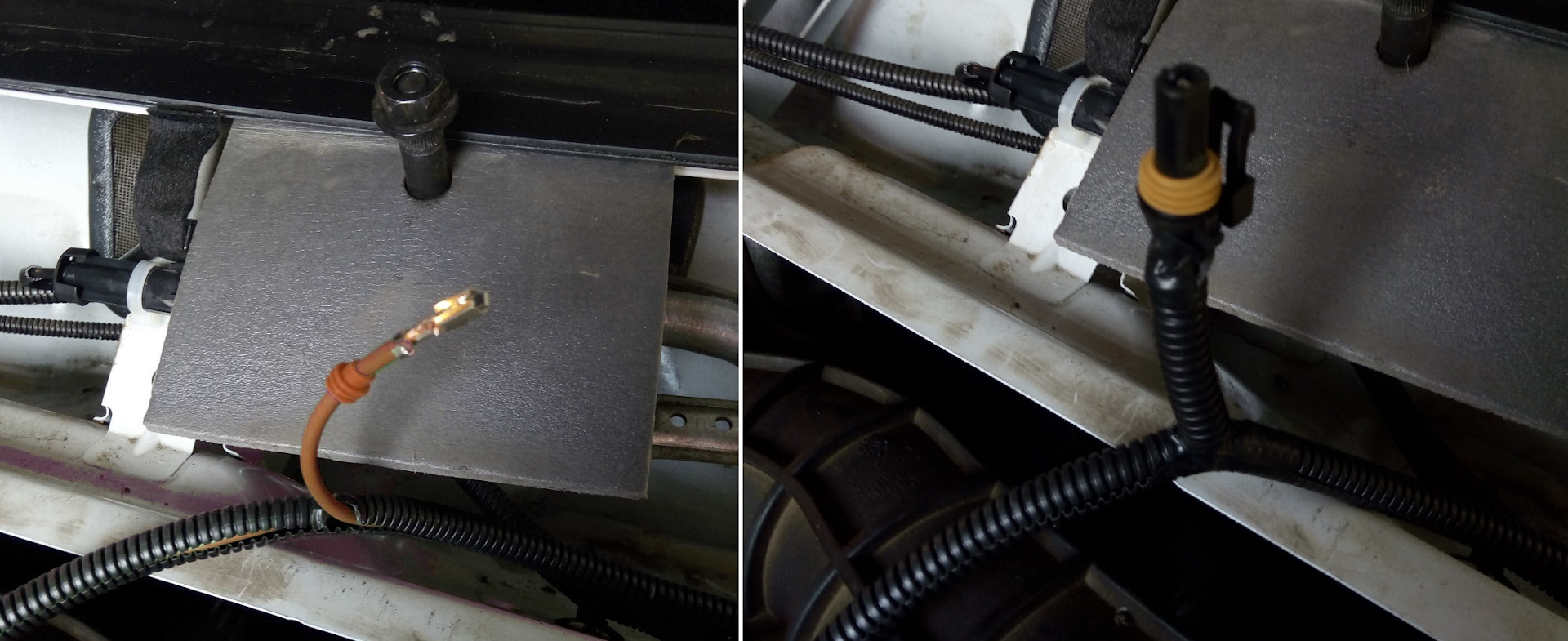 5. Концы проводки у лобового стекла обжать клеммами для подключения к лобовому стеклу. Клеммы вставить в разъем, провод завести в гофру и скрепить изолентой с другим проводами идущими в гофре.