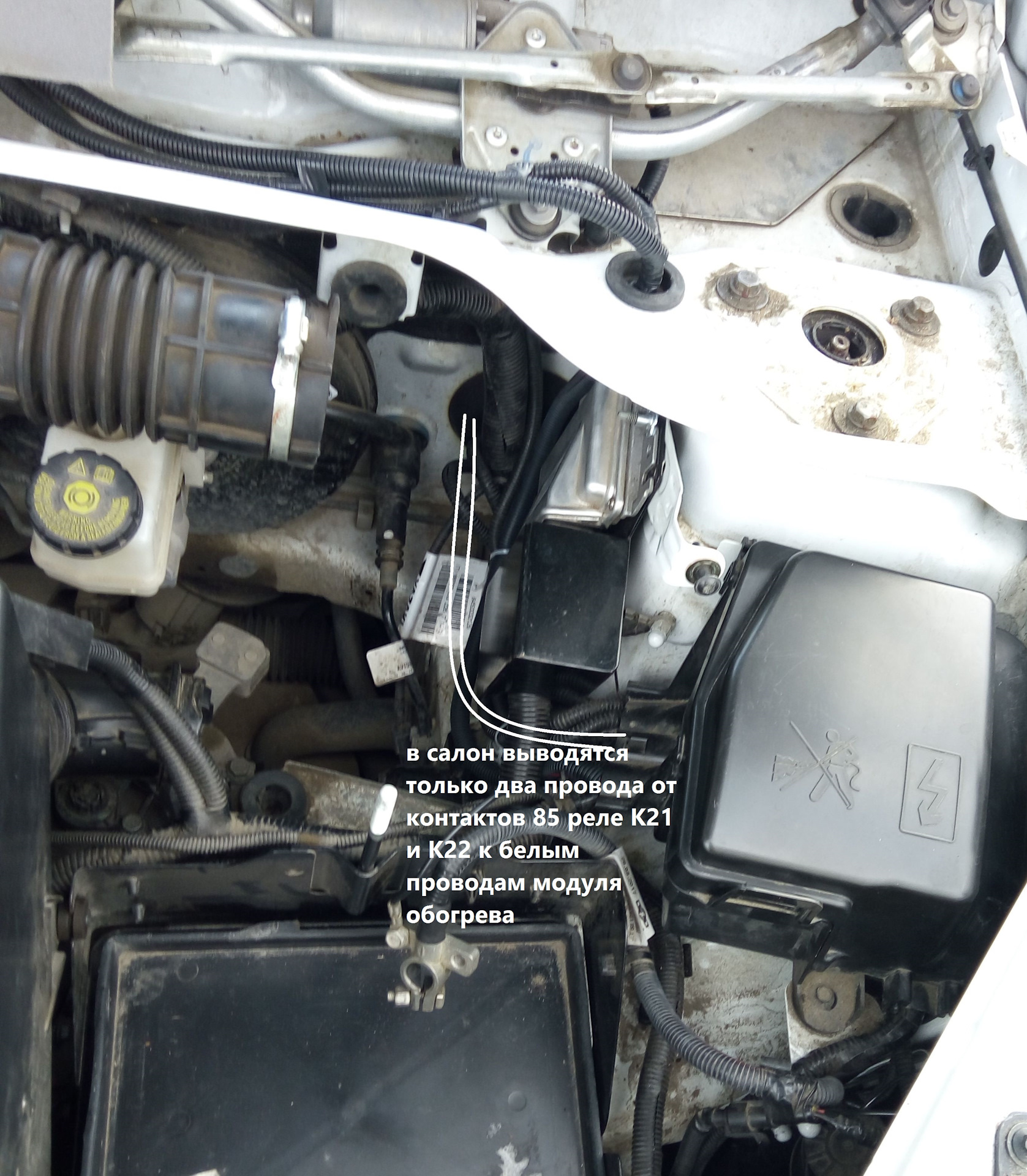 13. Вывести два провода малого сечения от контактов 85 силовых реле в салон. Там они будут подключены к двум белым проводам модуля управления обогревом.