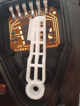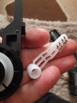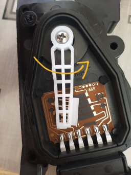 Он предлагает сдвинуть лапку (см. фото) на 1-2 мм. Если сдвинуть больше, чем нужно, то холостых оборотов не будет. Пластик новый, с первого раза эту лапку повернуть трудно. Нужно разработать открученную лапку, повернув ее туда сюда раза 3-4, не более, потом настроить и закрутить.