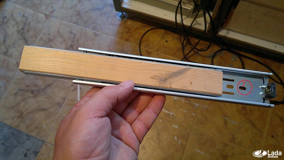 Вместо съемной части направляющих установили кусок доски. Направляющие крепятся на винты М6 длиной 20мм, которые проходят через отверстия №2. Центральный винт крепления петли (№1) является ограничителем хода направляющих.