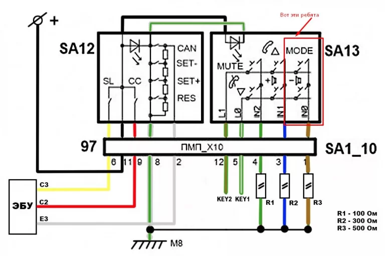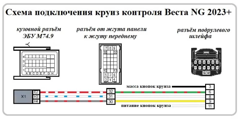 Дополняем колодку с проводами круиз-контроля проводами для управления магнитолой и вставляем в улитку. Тянем провода до магнитолы и подключаем в разъем mini-ISO синего цвета. Все по схеме: