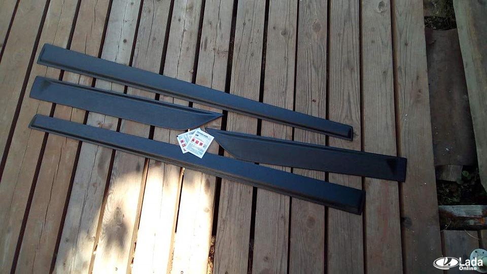 Накладки выполнены из АБС-пластика и крепятся к двери автомобиля при помощи двухстороннего скотча или герметика. После установки эти аксессуары не только меняют внешний вид (гармонируют с черным пластиком в переднем и заднем бамперах), но и способны защитить лакокрасочное покрытие от повреждений (например, при открытии дверей о парковочный столб).