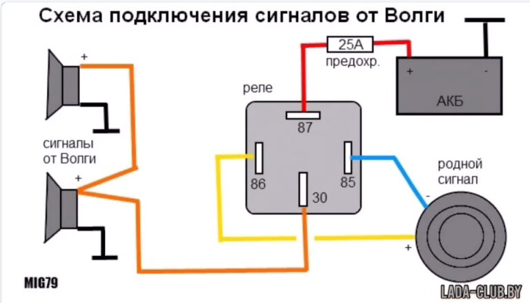 Штатные звуковые сигналы автомобилей LADA потребляют не более 5А, а клаксоны Волги по 7А каждый. В связи с этим для их подключение необходимо использовать 4-х контактное реле. Владельцы утверждают, что ставить доп.реле не обязательно. Схема подключения сигнала Волги универсальная для всех автомобилей: