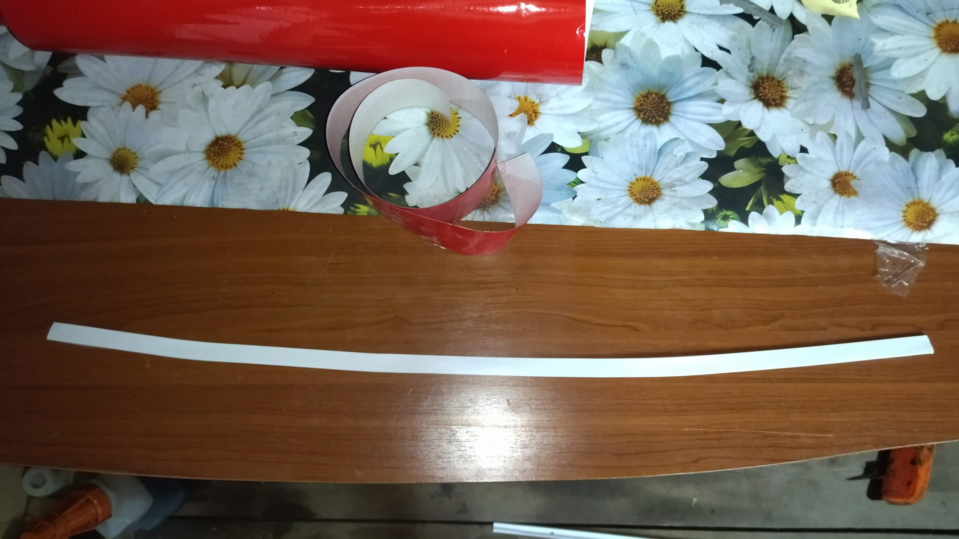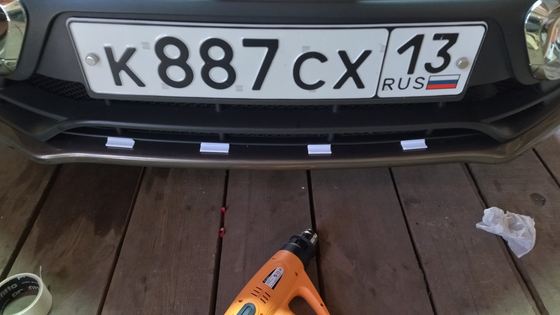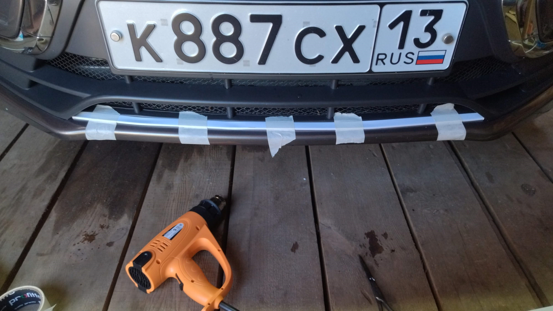 От кабель-канала используем только крышку. Форму придаем с помощью фена и малярного скотча. После этого открепляем накладку от бампера, обезжириваем и обклеиваем пленкой.