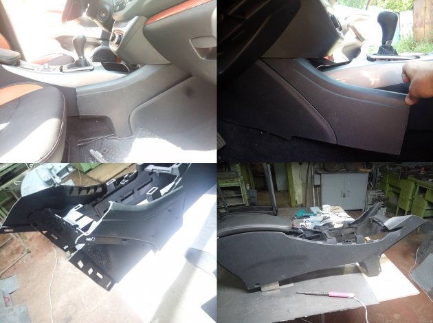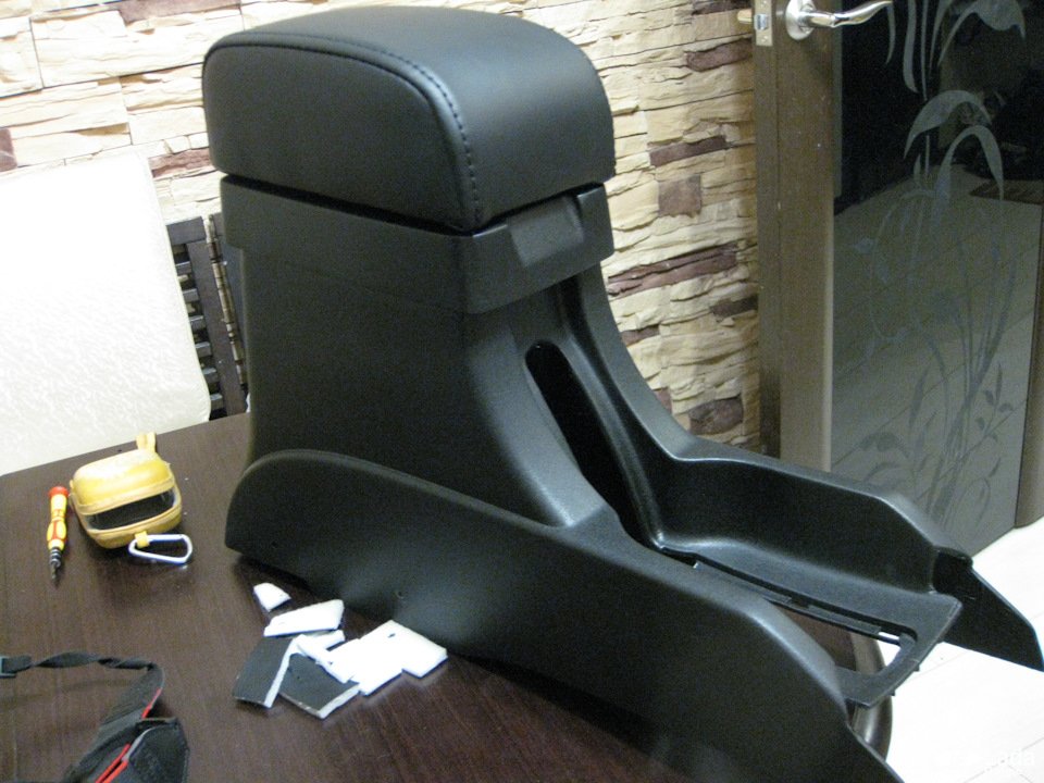 2. Есть другой способ поднять подлокотник, а также сделать его сдвигающимся. Потребуется универсальный подлокотник со сдвижной крышкой. Соединяем необходимые детали при помощи термоклея. Окончательный вид придаем при помощи тонкого пластика ПВХ, монтажной пены и шпатлевки. Подушку подлокотника перетягиваем эко кожей.