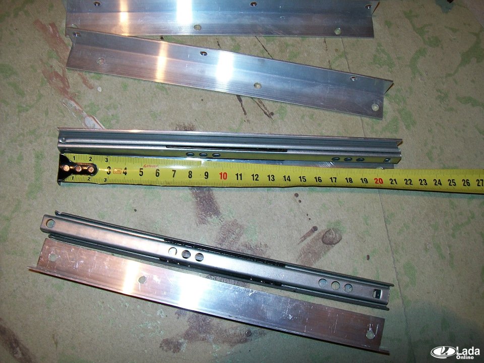 3. Еще один метод сделать подлокотник выдвигающимся. Потребуется: фиксаторы (для удержания подлокотника в крайних положениях), направляющие для выдвижных полок (25см), болты разной длины, гайки (диаметром 4мм), два алюминиевых уголка один (10х10 мм и 20х20 мм) и металлические пластины (вырезаем их по форме верхней части подлокотника).