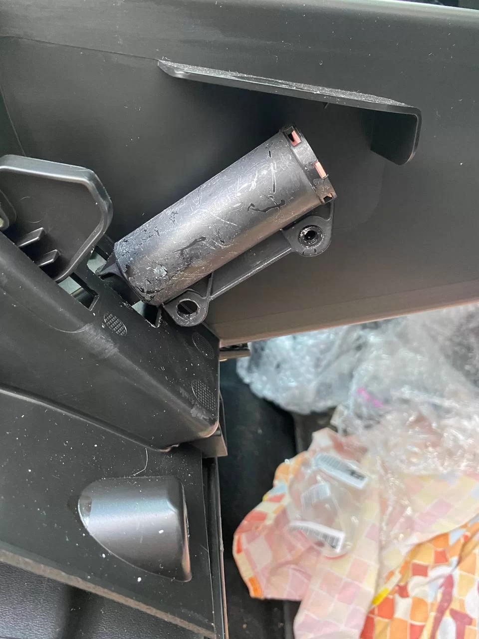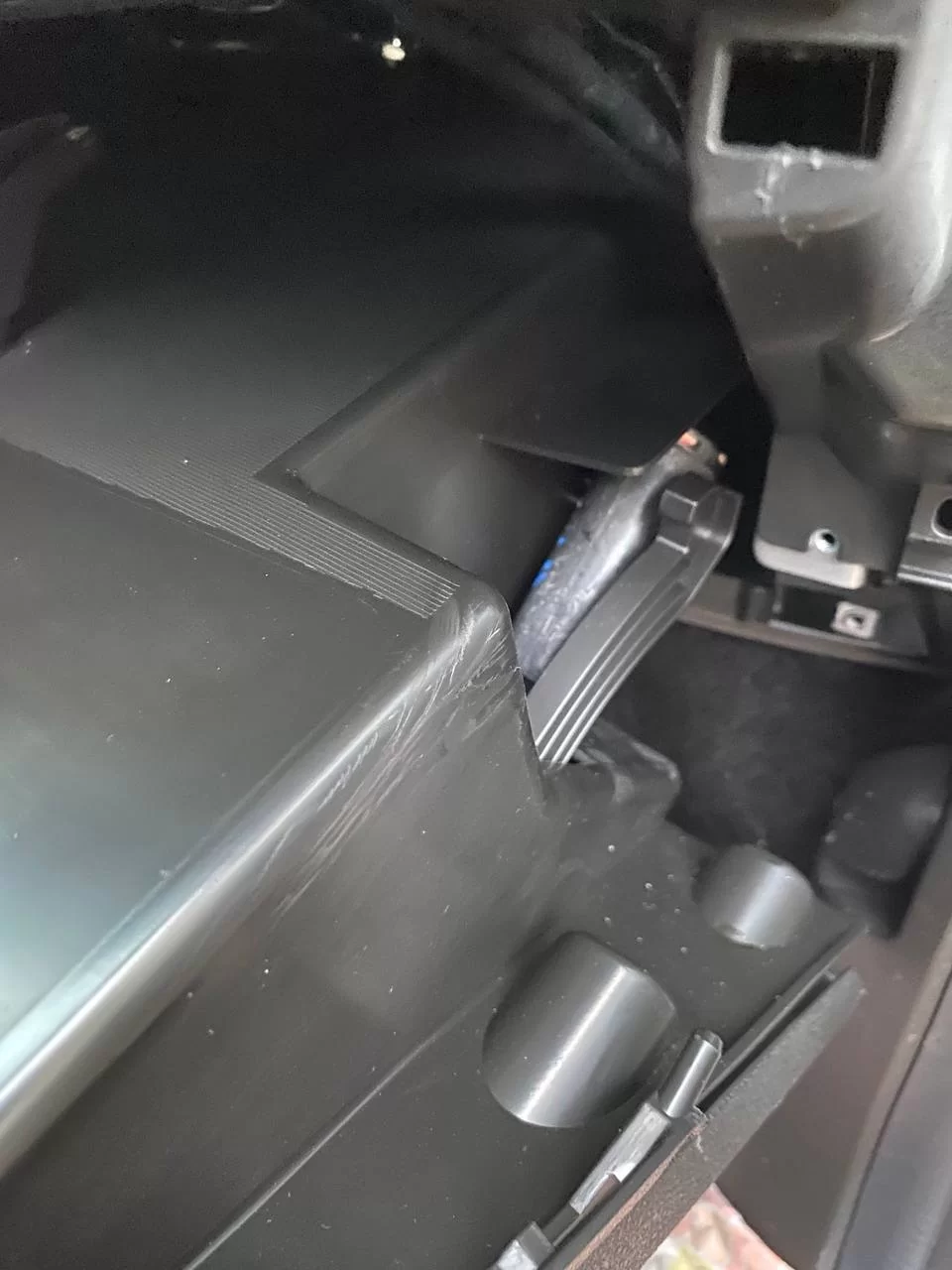 После снятие бардачка открываем его, тонким концом микролифта просовываем в отверстие в сам бардачок, но пока не закрепляем его. Толстой стороной к креплению (Нижние ушки должны смотреть вниз, как на фото, крепится только одним саморезом на дальнее (правое) крепление). Далее подбираем саморез (можно купить оригинал, 7703017090 артикул), крепим его,