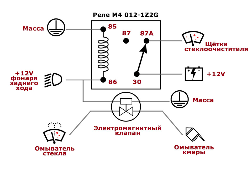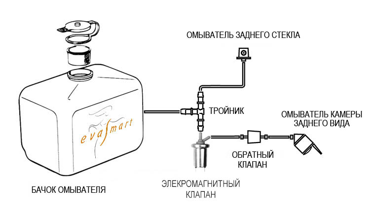 4. (По желанию) Если хотите, чтобы омыватель работал только при включенной задней передачи, тогда потребуется установить электромагнитный клапан и реле.