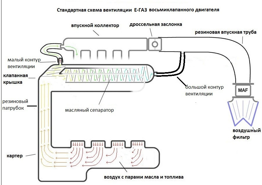Система вентиляции картерных газов двигателей ВАЗ состоит из двух контуров, которые работают на разных режимах нагрузки и оборотах: