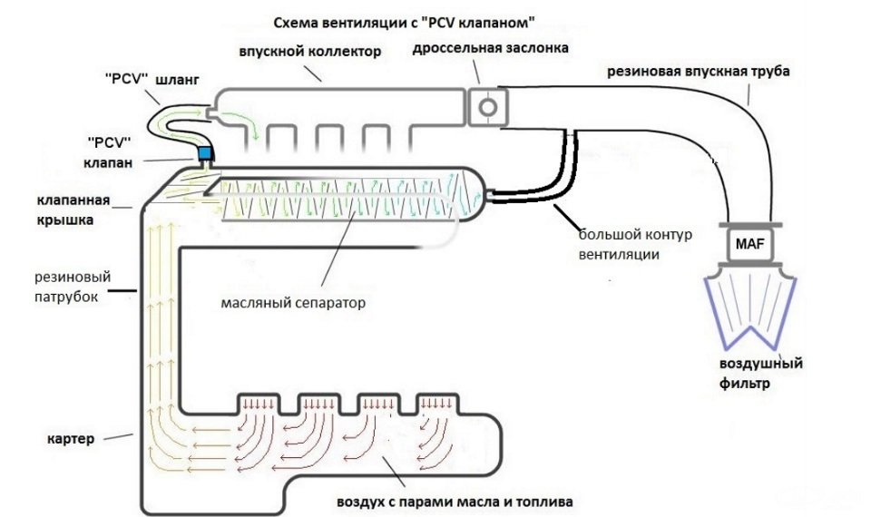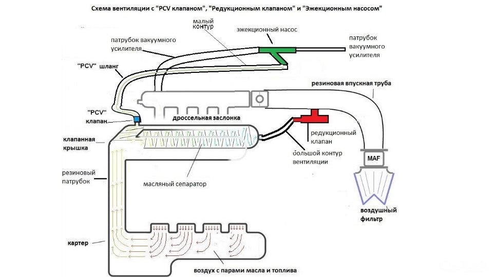 ![схема вентиляции с PCV клапаном и редукционным клапаном схема вентиляции с PCV клапаном и редукционным клапаном]()