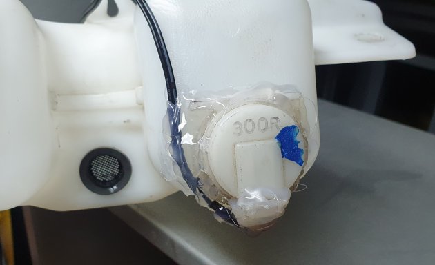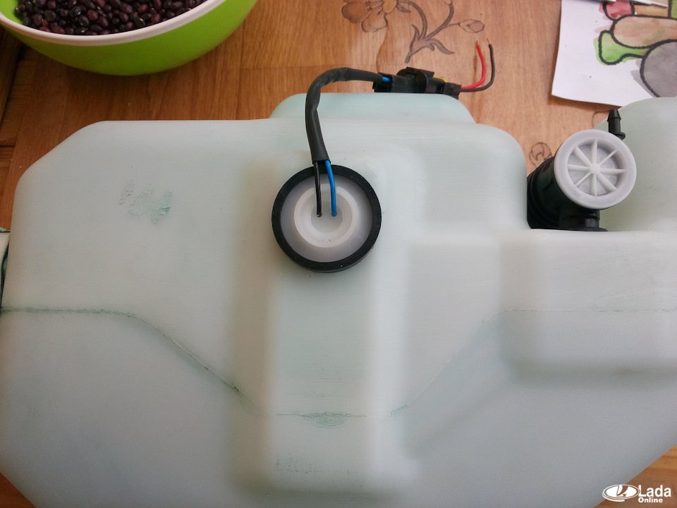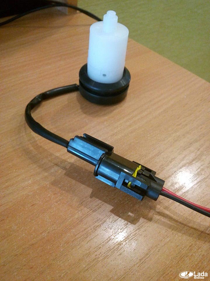 Бачок стеклоомывателя на Весте невысокий, поэтому был выбран датчик уровня омывающей жидкости, который предназначен для установки в дно бачка. Чтобы подсоединить разъем от ПТФ нужно немного срезать уплотнитель. Принцип работы датчика простой: когда жидкость в бачке заканчивается, поплавок датчика опускается и замыкает цепь.