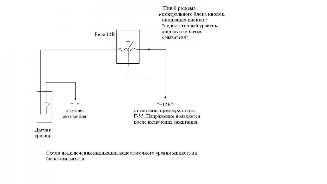 После доработки индикатор загорается, когда в бачке стеклоомывателя остается около 1,3-1,5 литра жидкости. Кстати, раз пришлось снимать бачок, доработайте его и установите обратный клапан.