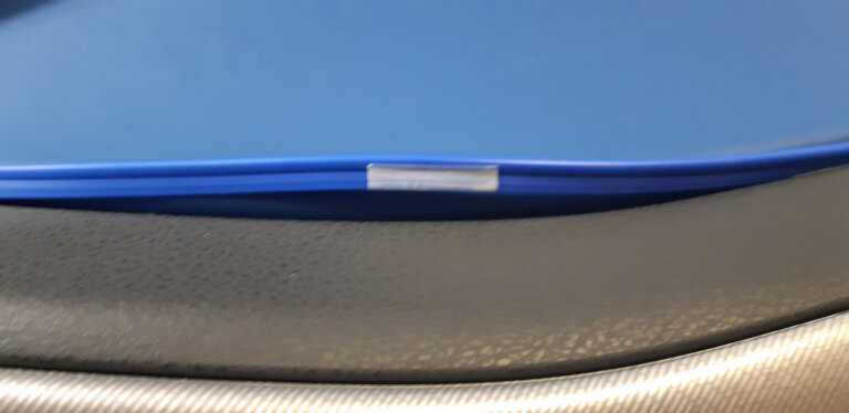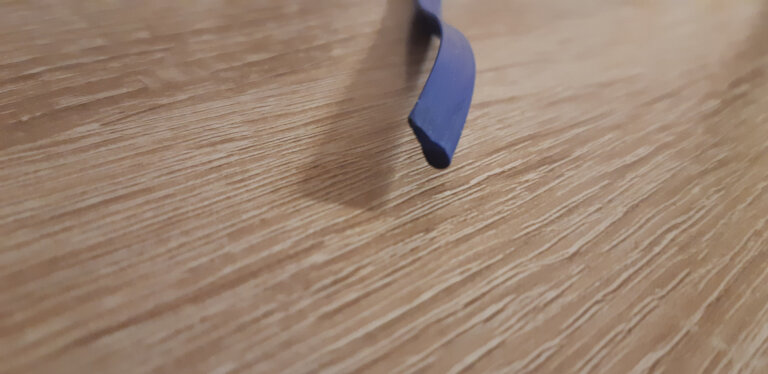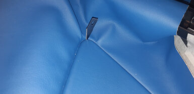 7. Прогреваем паз и проходимся по нему монтажными лопатками, стараясь более тщательно проклеить уже отрезанный край кожзама.
