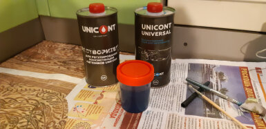 4. Клей разводим в пропорции 3 к 1. Наносим клей на поверхности обоих частей. Ждем 15 минут.
