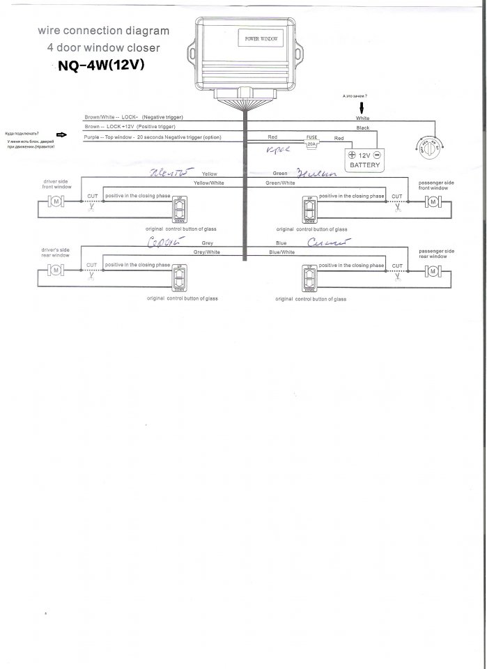Провод, подающий положительный импульс при закрытие центрального замка на блок доводчика стекол - розовый с красной полоской (двух контактная фишка на замке двери).