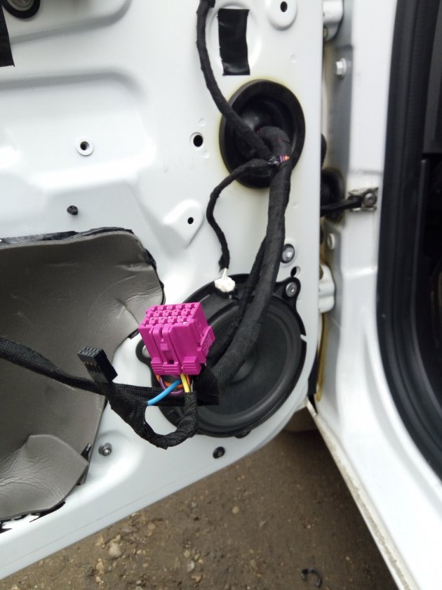Проводов для задних ЭСП нет, поэтому проводку придется прокладывать самостоятельно. Выводим провода из из водительской двери. Тут либо покупаем клеммы мама/папа в дверной разъем, либо делаем отверстия дрелью.