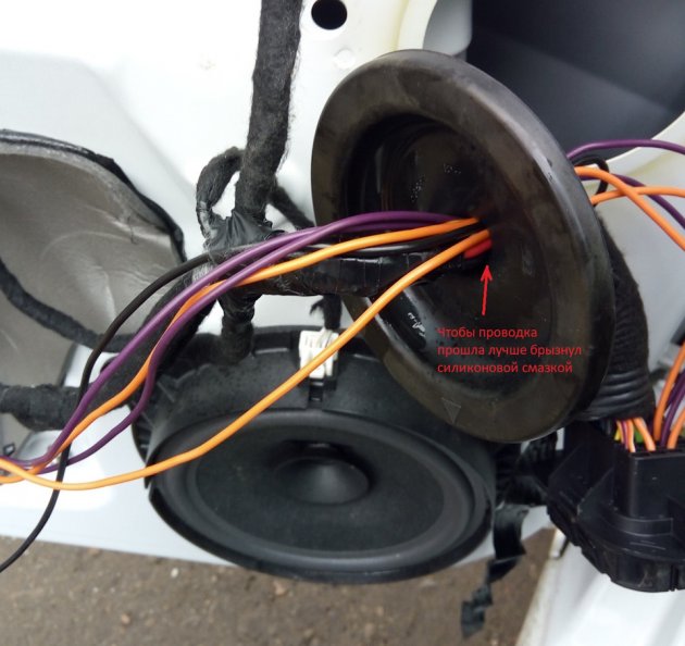 Далее провода протягиваем под порогом к задней левой двери, а затем под диваном к задней правой двери.