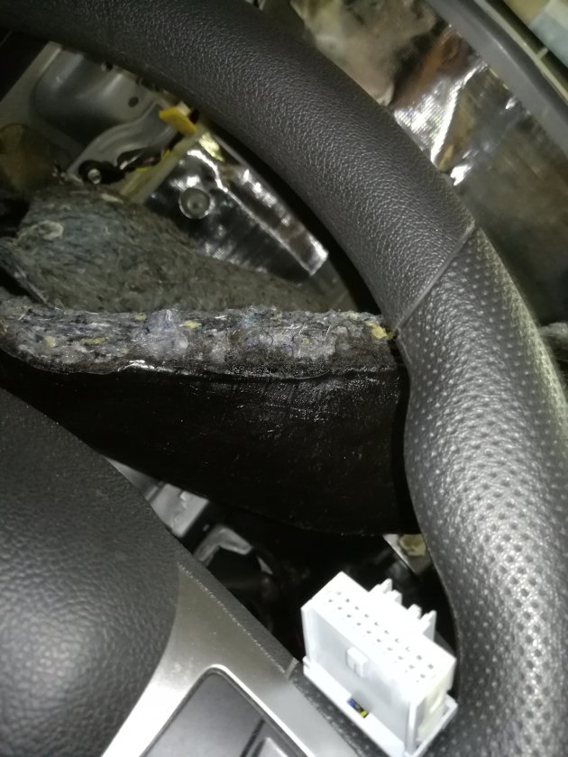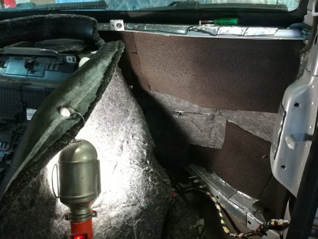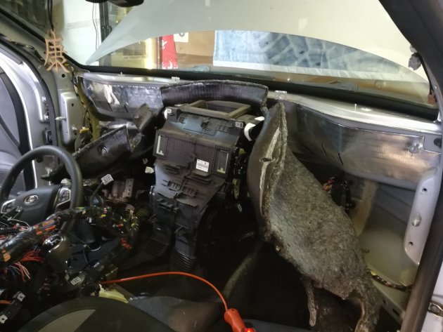 Лада Веста имеет хорошую штатную шумоизоляцию моторного щита со стороны салона. Эта часть кузова накрыта толстым слоев виброизоляционного материала, а также плотным матом с войлоком (который также используется на полу). В данном случае будет достаточным наклеить на верхнюю часть отопителя и воздуховодов звукопоглощающий материал.