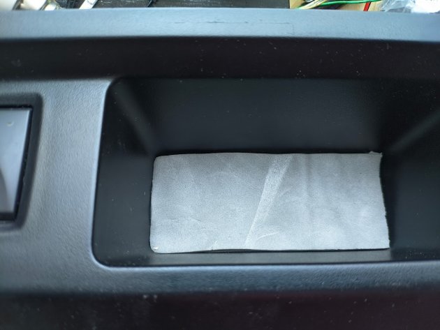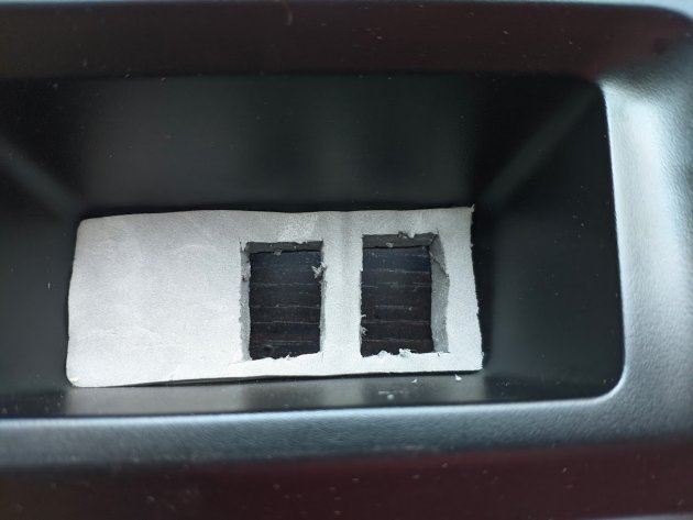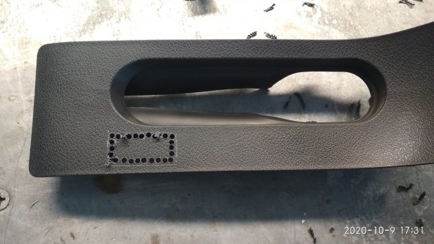 В багажнике розетка 12 В крепится на обшивку. Чтобы ее усилить используйте кусок МДФ или фанеры. Отверстие вырезаем перьевым сверлом.