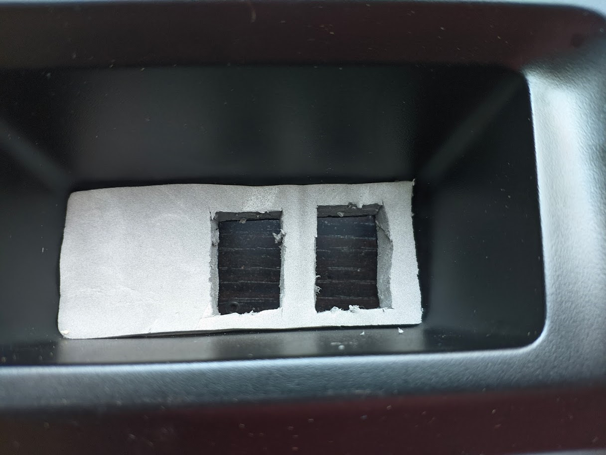 В салоне автомобиля ее удобней всего разместить на центральном тоннеле. Для этого его нужно снять, вырезать отверстие (используем канцелярский нож) и закрепить розетку.