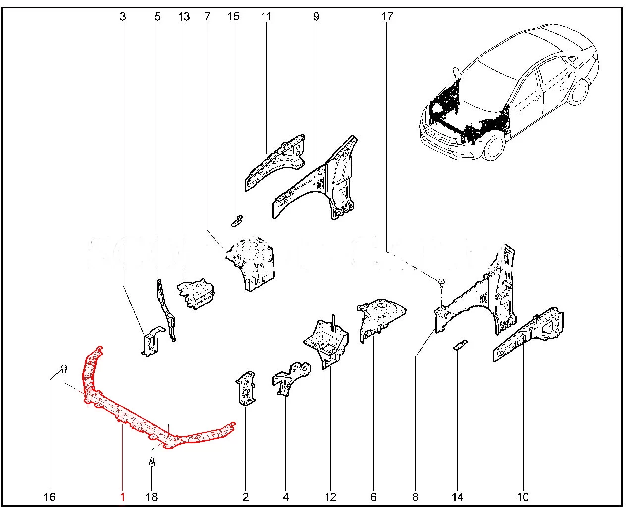 Потребуются позиции 1-12 (кроме 3). Позиция 13 (усилитель переднего бампера средний) можно использовать старый.