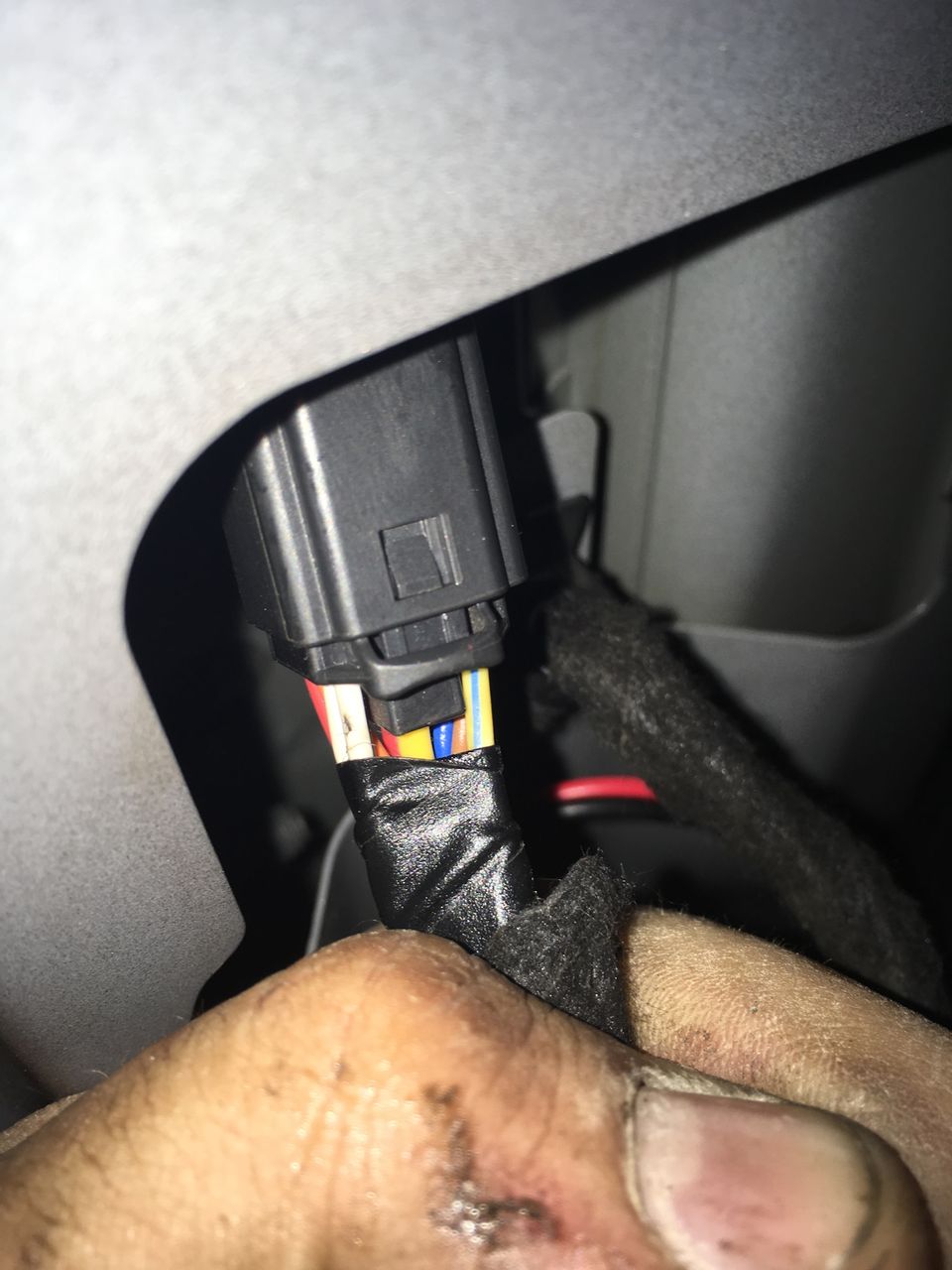 Снимаем обшивку багажника с левой стороны, а также накладки порога и центральной стойки. Находим разъем в технологическом отверстии на центральной стойке, провода от которого идут к задней двери. Подключаемся к двум крайним проводам (бело-черный и желто-голубой).