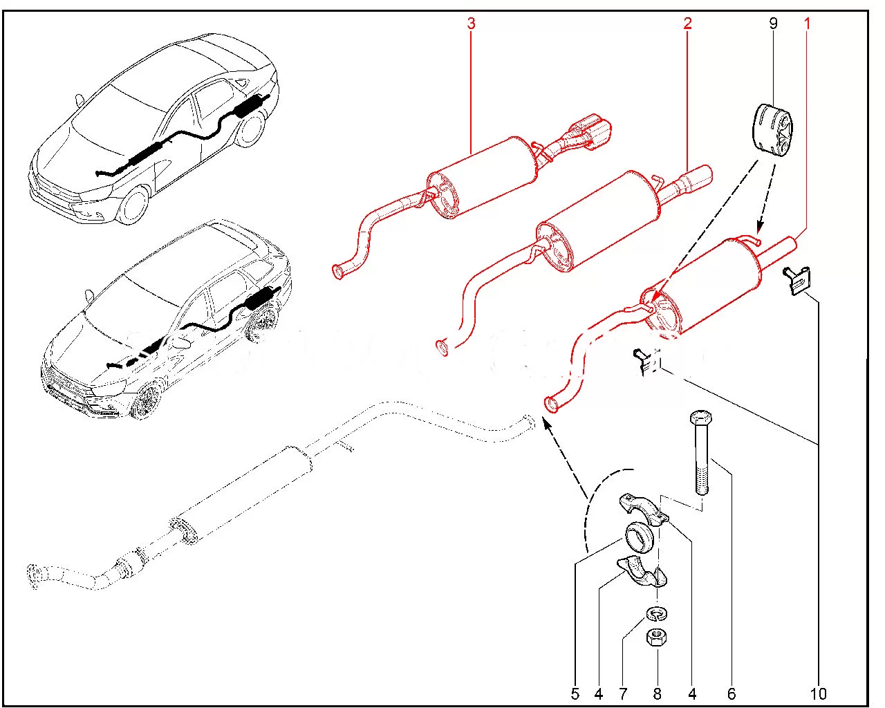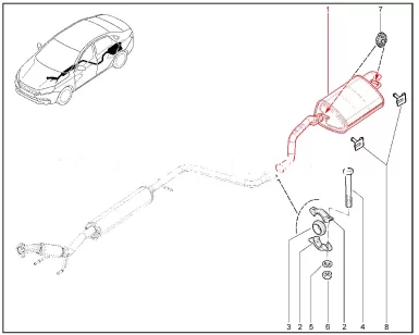 В зависимости от версии исполнения на старой Весте может использовать три вида основных глушителей (артикулы 8450006415, 8450031918 и 8450031142. Все они имеют круглую форму. На Lada Vesta NG используется глушитель с бачком треугольной формы (артикул 8450040523)