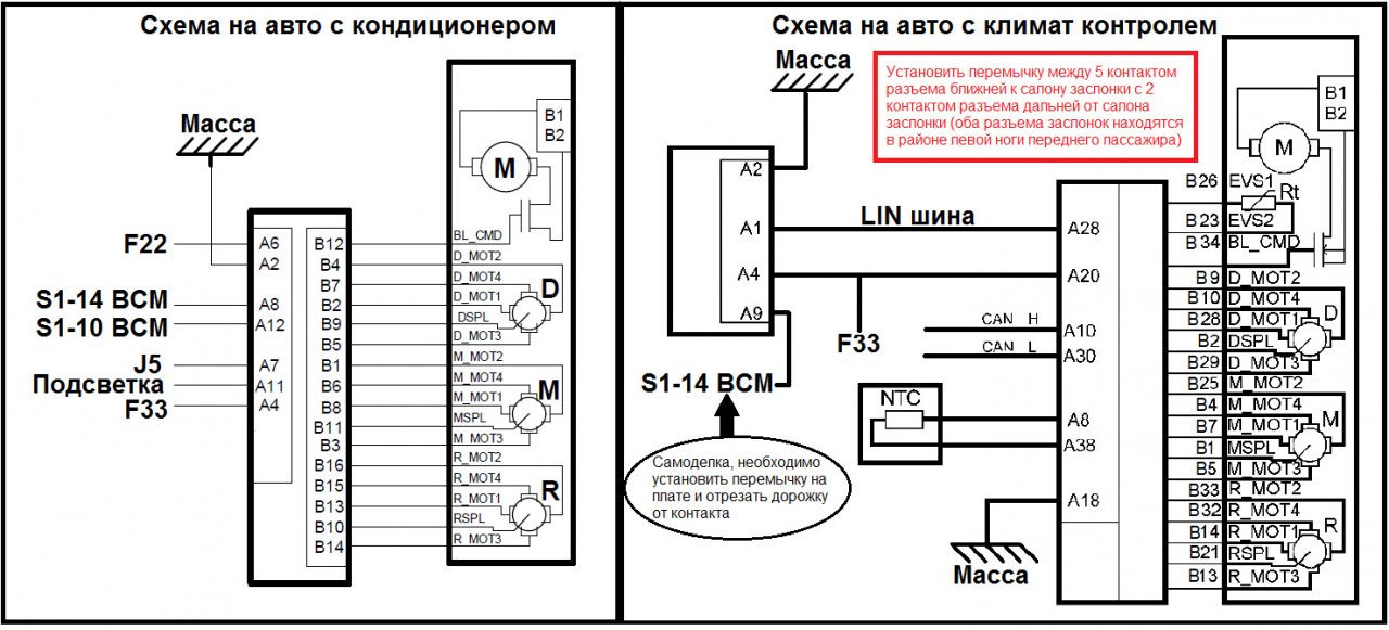 Внимание! После установки климат-контроля нужно будет «прописать» его в ЦБКЭ либо доработать блок управления климатом (припаять кусок провода, см. фото ниже), в противном случае не будут работать обогревы стекол. Это происходит из-за разных типов сигналов. На простом кондиционере используется аналоговое управление, а на климат-контроле — цифровое, через CAN-шину.