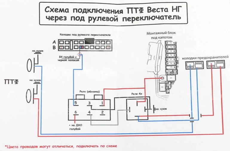 - Нештатный. Подключение выполняется по универсальной схеме минуя электронный блок управления электроникой. Включение/выключение ПТФ выполняется через выключатель (кнопку).