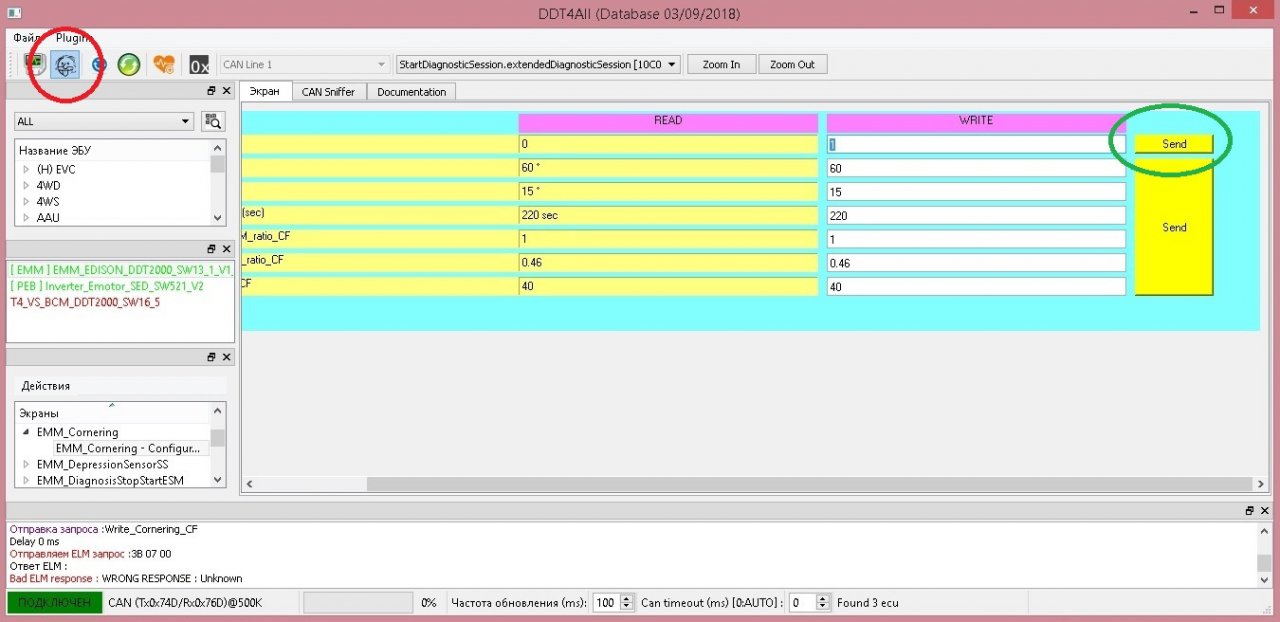 - В поле READ значение должно поменяться на 1. Значение 40 в поле READ функции Cxx_CorneringSpeed_CF означает, что функция подсветки поворотов будет работать до 40км/ч (можно изменить по желанию, также при помощи кнопки Send).