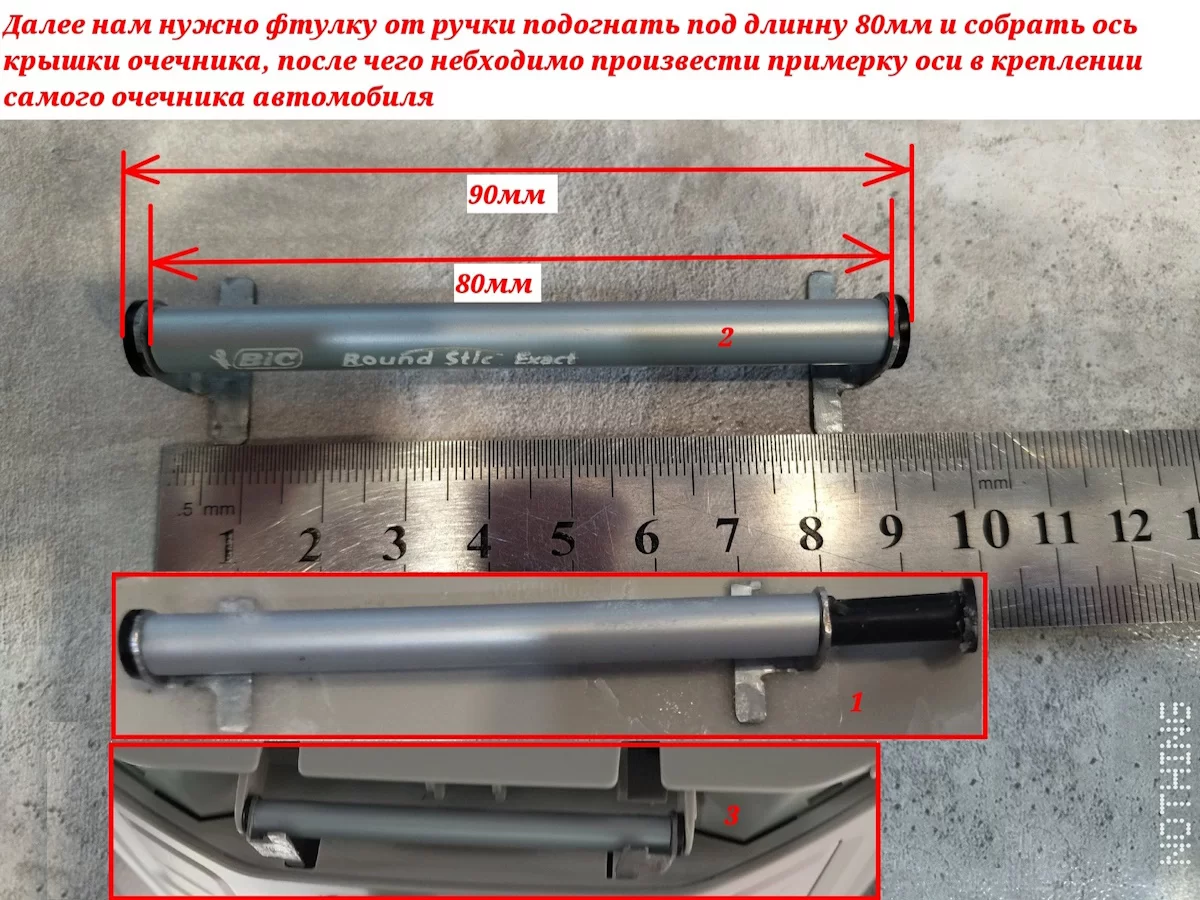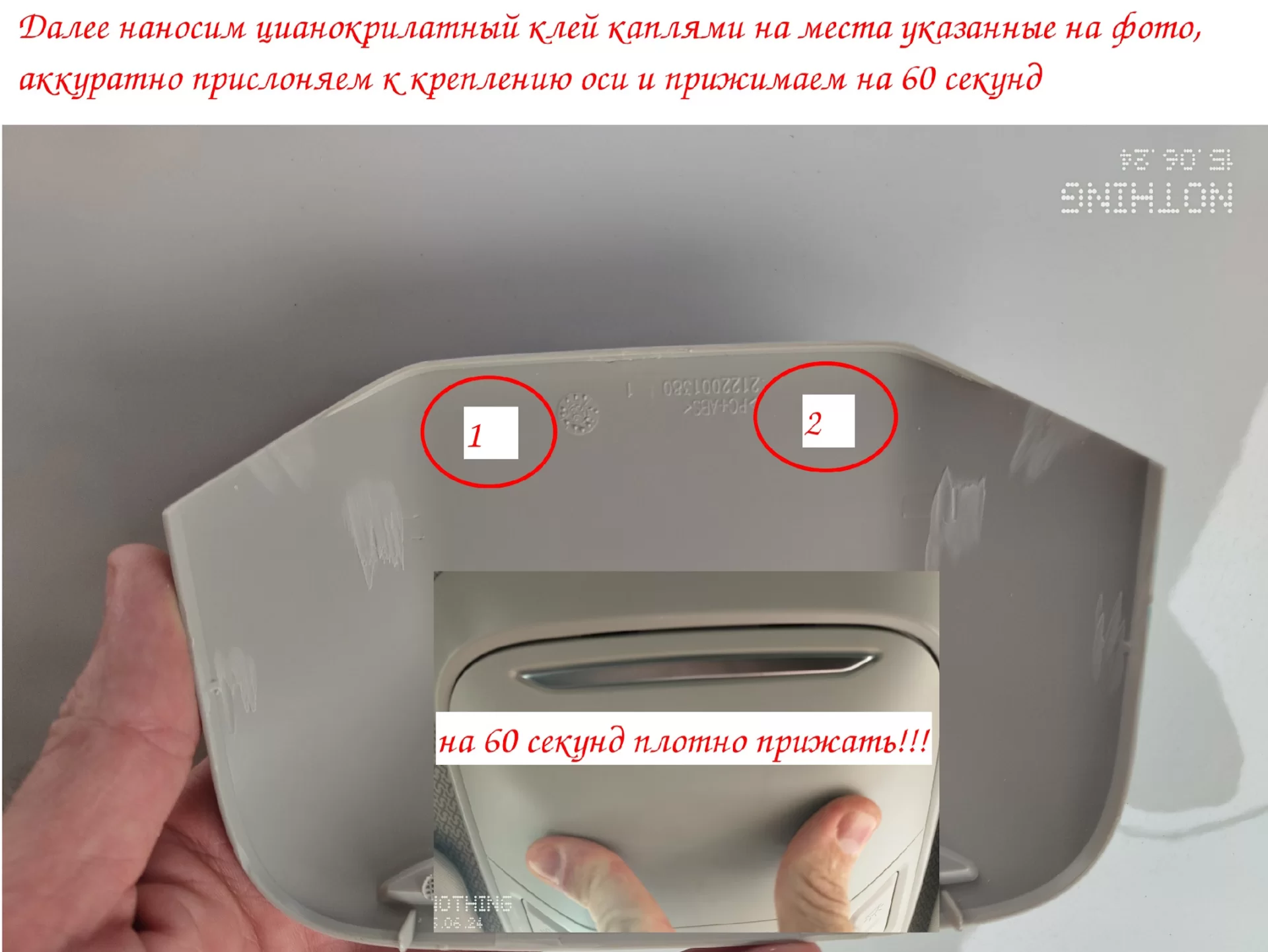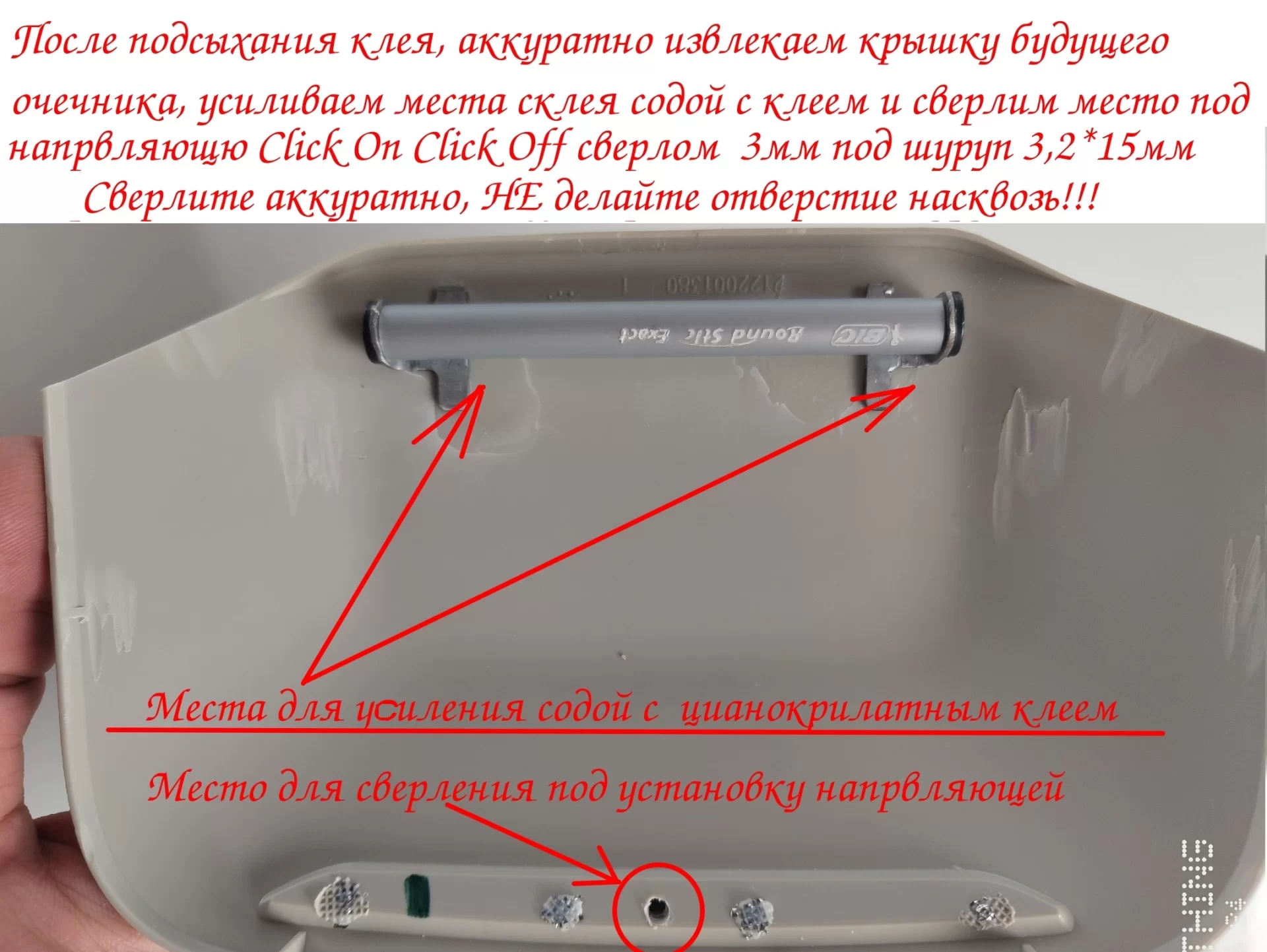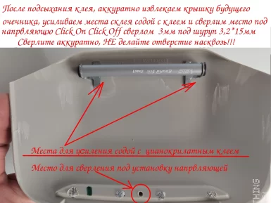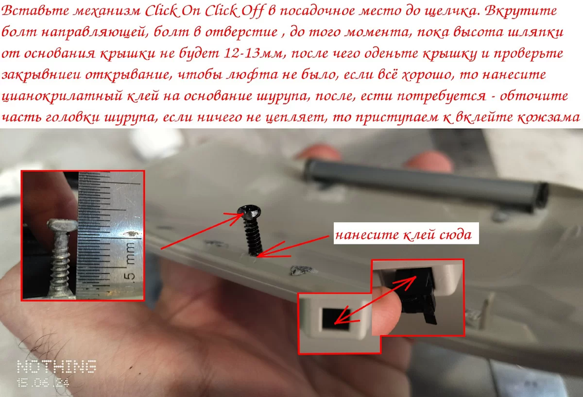 - Установка механизма Click On / Click Off и вклеивание направляющей ноги для фиксации закрытия крышки очечника;