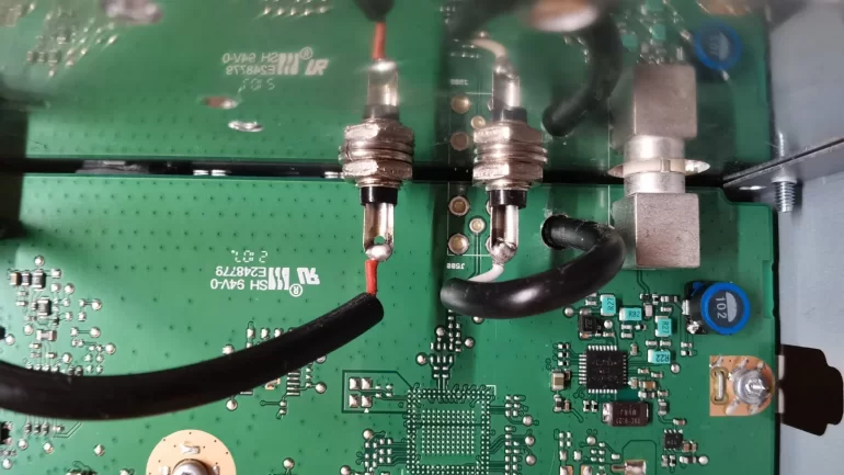 8. Перед установкой верхней крышки припаиваем жилы провода к разъемам