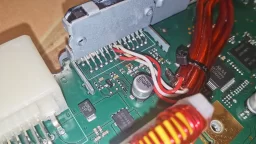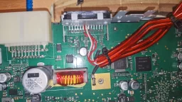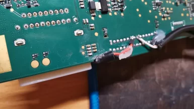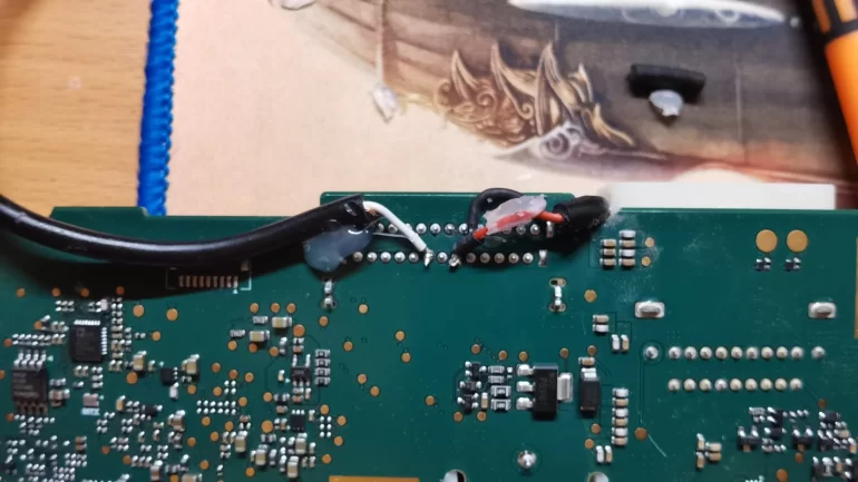 Поздней автор перепаял выходной сигнал. Припаялся на этот раз перед фильтрами (конденсаторами и резисторами) усилителя. На фото красным отмечены места припайки сигнала, черным земли: