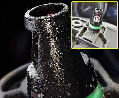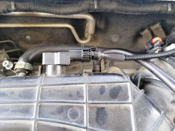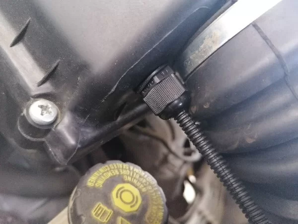 В коллекторе датчик температуры воздуха и датчик абсолютного давления (ДАД) объединены в один корпус и имеют общий разъем и массу. Поэтому используем два разъёма, чтобы оставить питание на ДАД, но отцепить от него ДТВ. То есть внешний ДТВ подключается в разрыв цепи.