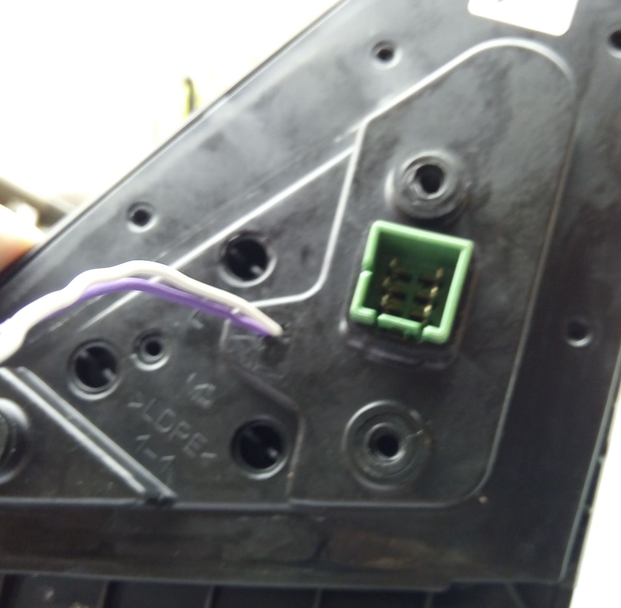 - Внутри зеркала провода укладываем внутри пластиковой оболочки вместе со штатными проводами подогрева (на фото белый и фиолетовый провода идут на светодиод).