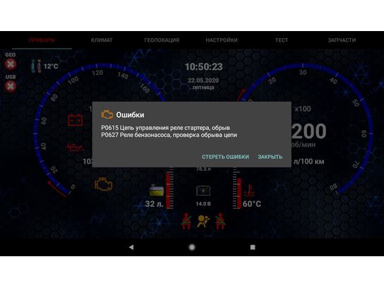 - Отображение ошибок в ЭБУ, с расшифровкой, возможность удаления ошибки;