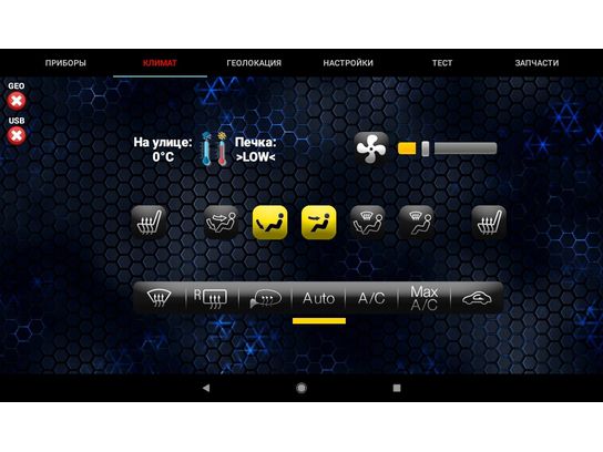 - Отображение параметров: скорости, оборотов, температуры двигателя, температуры снаружи, среднего расхода, общего пробега, напряжения в сети, количество израсходованного топлива, остаток пути на топливе, данных климатической системы (для авто с климатом), включенного ручника, низкого заряда, низкого давления масла, непристегнутого ремня пассажира и водителя, неисправности AirBag;