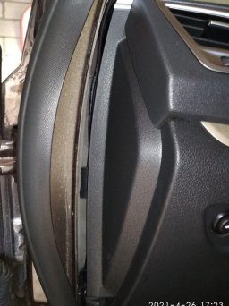 В Сети периодически появляются фото владельцев, на которых отчетливо видно, что дверной уплотнитель с водительской стороны постепенно сползает под бортик боковой накладки торпеды, в результате образуется щель. Проблема либо в неправильной форме боковой накладки торпедо, либо в недостаточной ширине её бортика, на который сверху ложится уплотнитель.