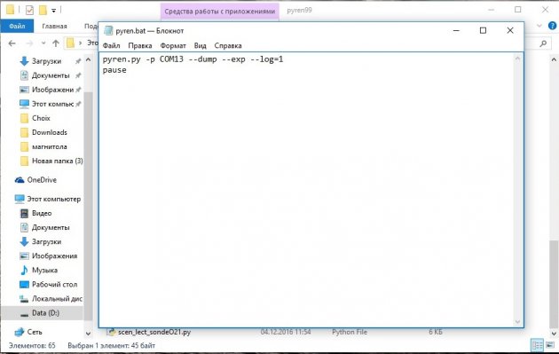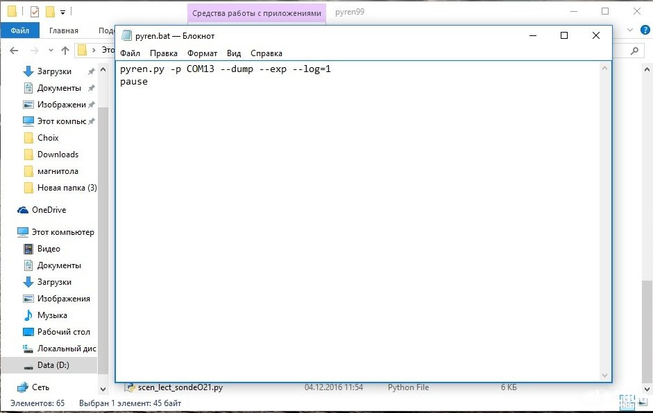 - в папке pyren99 создаем файл pyren.bat (содержание: pyren.py -p COM13 --dump --exp --log=1).