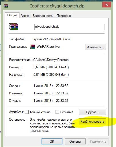 4) Разблокировать файл (требуется для отключения встроенного «защитника windows» для скаченного архива).