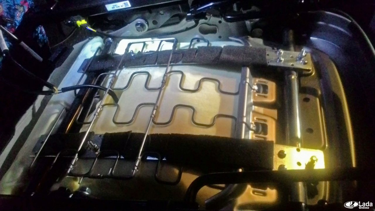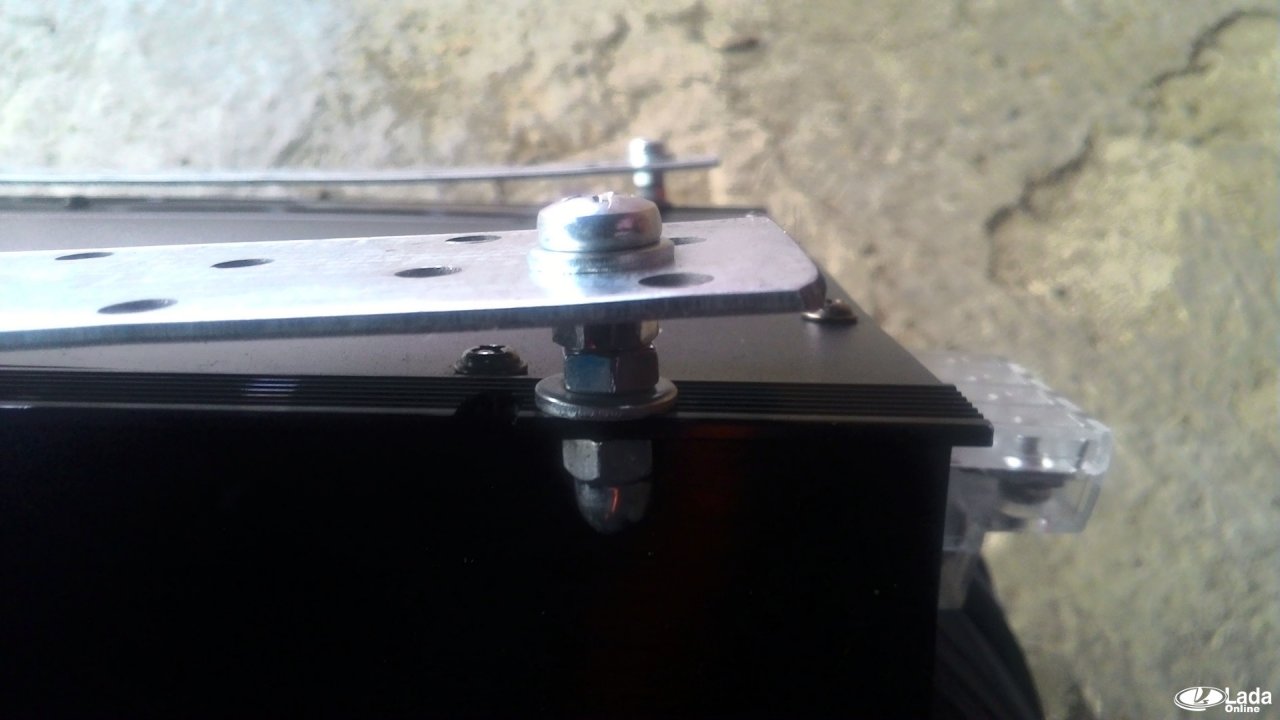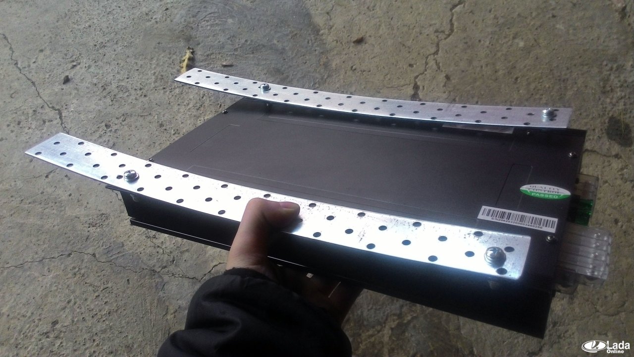4. Установка усилителя на Весте под переднем сиденьем. Усилитель крепится на двух металлических пластинах. Купить их можно в строительном магазине. Пластины уже имеют свой естественный изгиб, как раз под изгиб сиденья. В свою очередь эти пластины будут прикреплены к сиденью, с одной стороны на скобы, с другой просто вставлены под пружины.