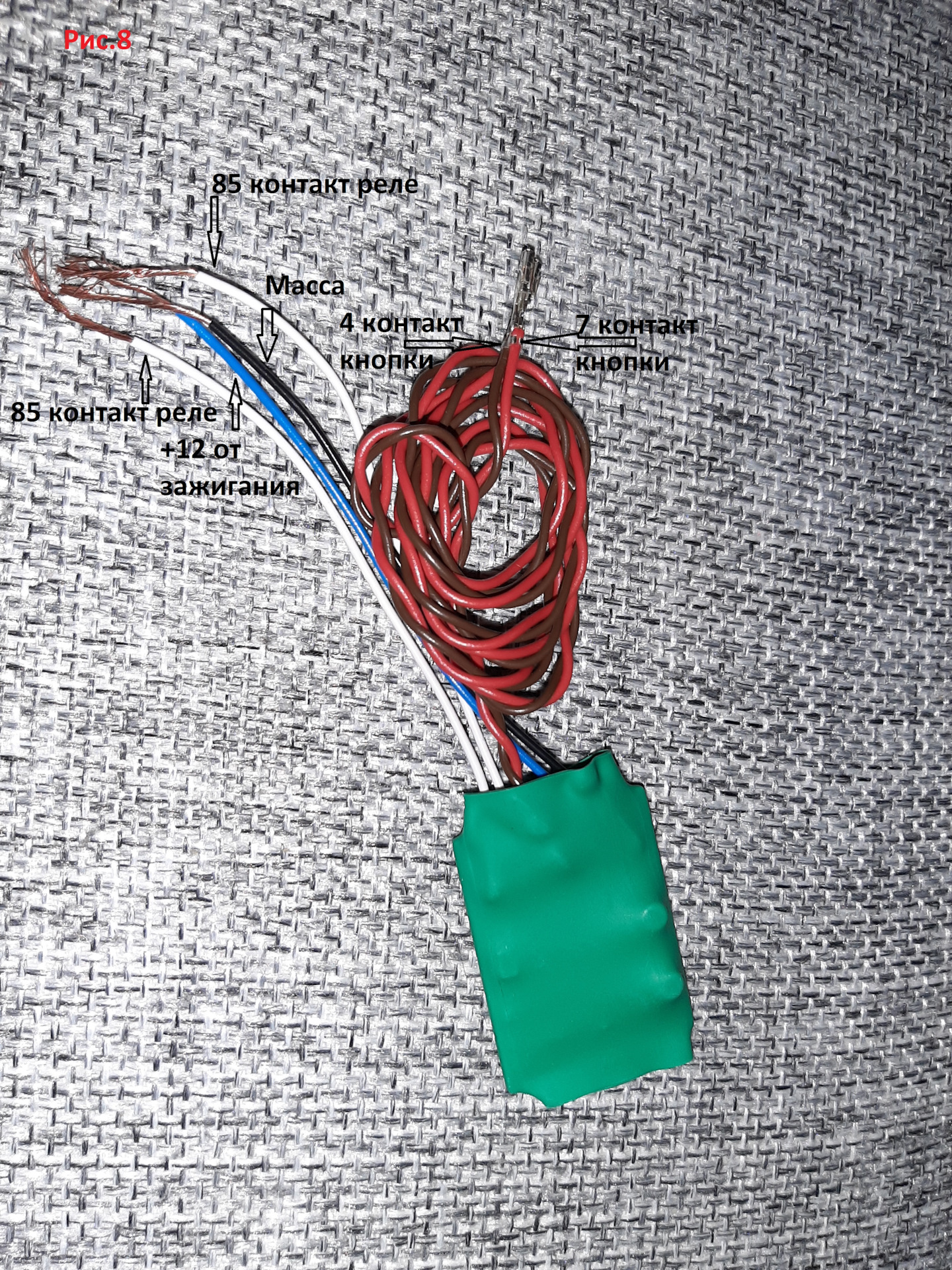 10. Черный провод с платы это минус, голубой +12В от зажигания, эти два провода объединяем с питанием кнопки парктроника. Контакт 8 это "+" и контакт 5 - это масса. Подключаем их на проводку питания прикуривателя.
