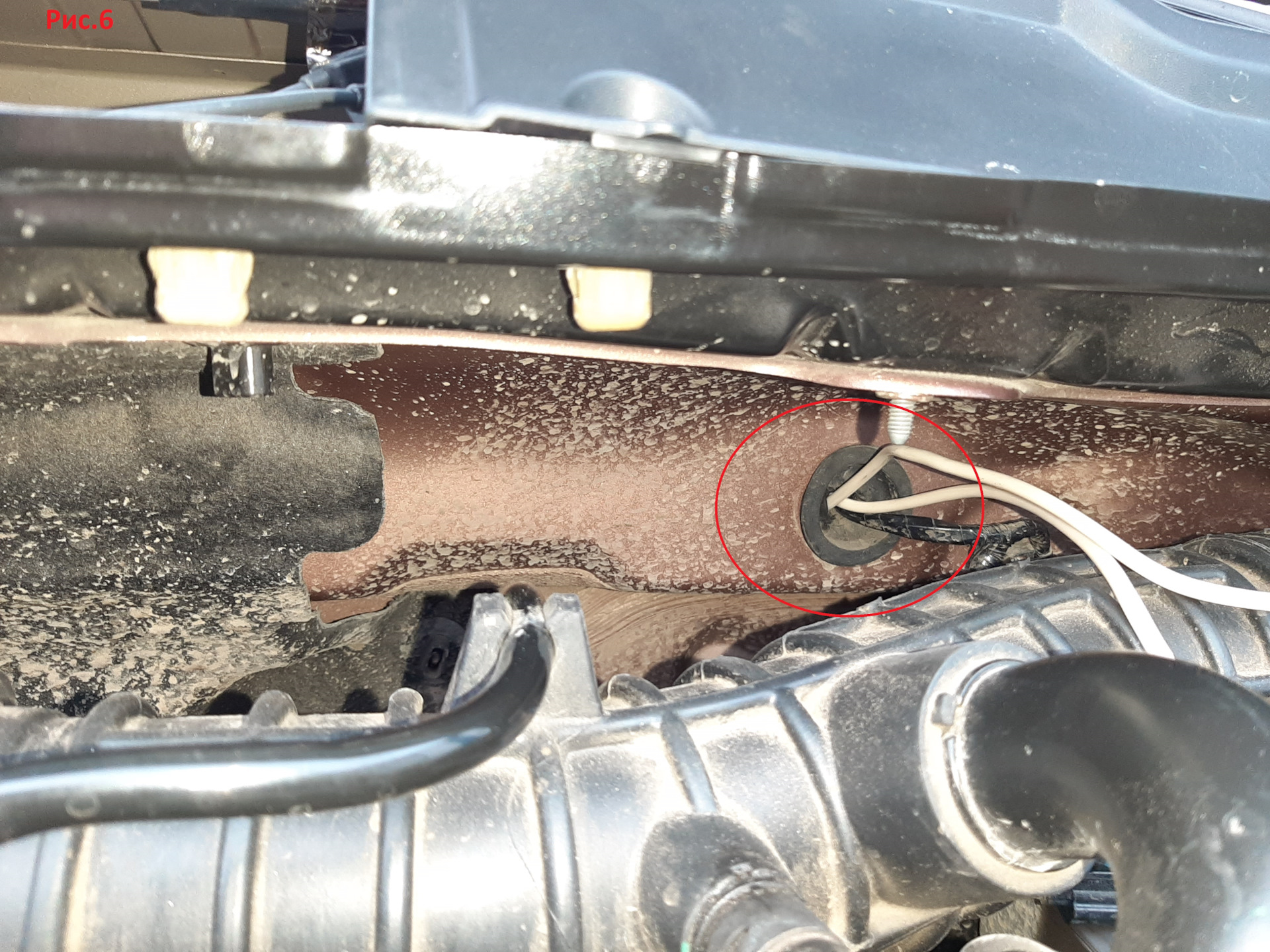 3. Проложить провода в подкапотное пространство через резиновую заглушку в центральной части. Два белых провода с рис.6, идут к колодке реле в места контакта 87 силового реле схемы рис.1.
