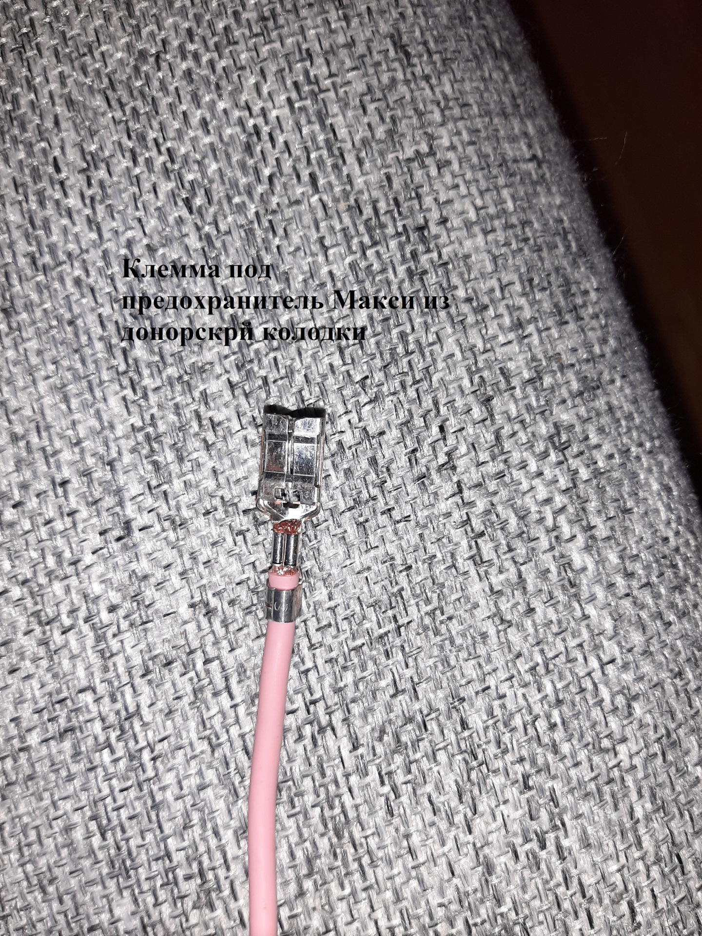 4. Два куска провода сечением 4 мм обжимаются с одной стороны лирой 6.3, с другой клеммой под предохранитель Макси и вставляются соответственно лирой в колодку силовых реле 30му контакту, вторым концом в колодку предохранителей.